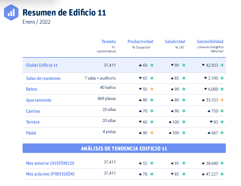 Desde JG proponemos, como sabéis, la implantación de una plataforma de integración de las soluciones Smart instaladas, que monitorice el funcionamiento de estas, en línea con lo que sistemas de certificación smart como Smartscore están requiriendo. Nuestra plataforma propia es IRIS JG, compitiendo con otras soluciones existentes en el mercado. También es muy importante que la plataforma genere los informes de analítica de prestaciones de los edificios, lo que venimos a llamar el PLACE ANALYTICS REPORT. A nivel de porfolio, edificio o zona, el informe resume la evolución de los indicadores ESG de sostenibilidad, salubridad, y productividad escogidos, y presenta posibles acciones de mejora.